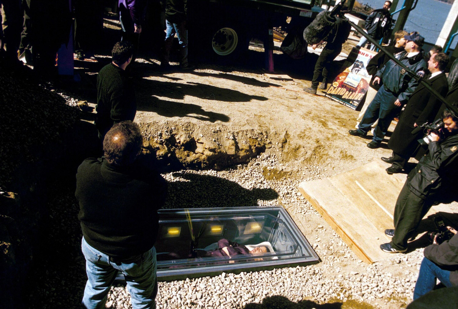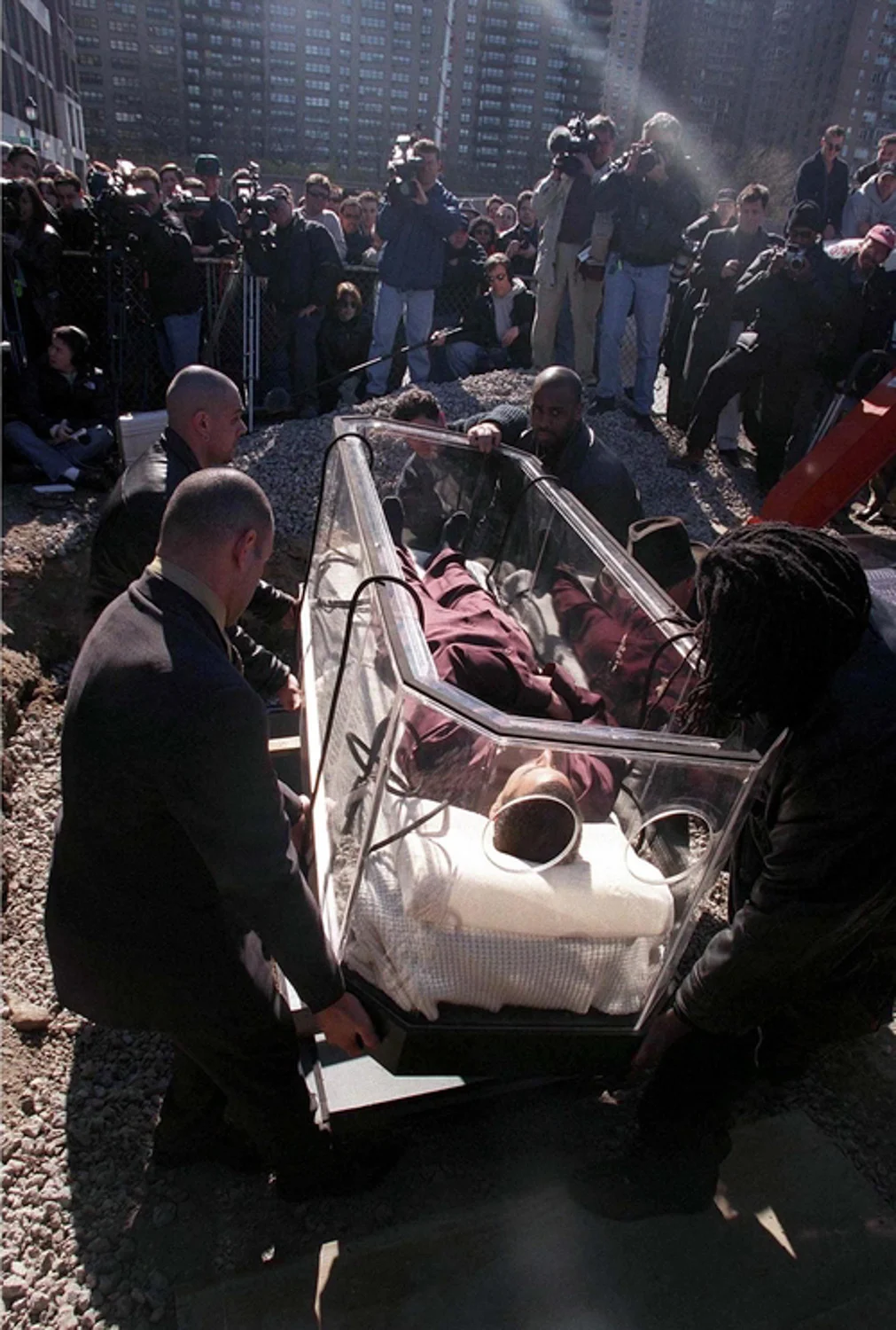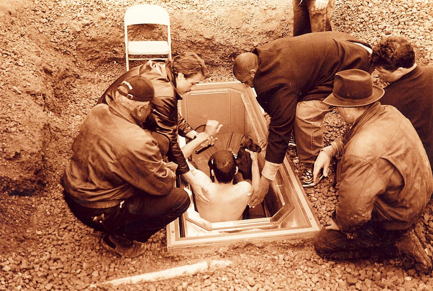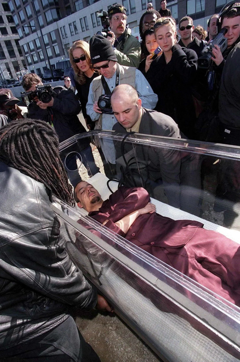 ON APRIL 5, 1999, in his first public endurance feat, BLAINE WAS buried underground in a plexiglas coffin UNDERNEATH A 3-TON WATER-FILLED TANK FOR SEVEN DAYS and nights, surviving on nothing but liquids.
