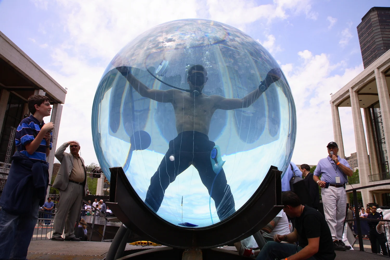 ON MAY 1, 2006, BLAINE WAS SUBMERGED IN An 8-foot diameter WATER-FILLED SPHERE IN FRONT OF LINCOLN CENTER IN NEW YORK CITY FOR SEVEN DAYS AND NIGHTS, USING TUBES FOR AIR AND NUTRITION. suffering liver and kidney damage, HE CONCLUDED THe STUNT BY ATTEMPTING TO break the record of 8 minutes 58 seconds for breath holding.